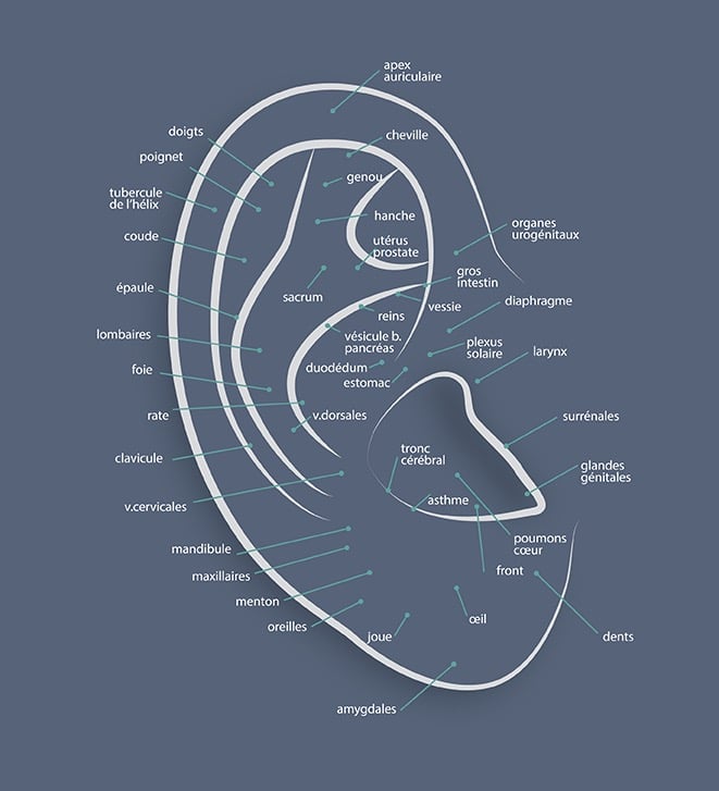 Certains points-clés de l’oreille, comme le point Shen Men (porte de l’esprit), le point du système nerveux autonome, ou encore ceux liés au plexus solaire ou aux glandes surrénales, renforcent cette action de rééquilibrage profond.